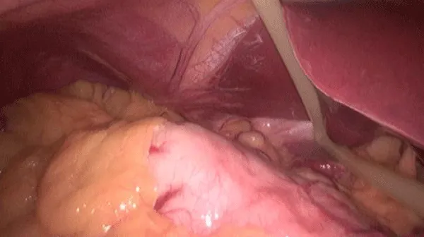 The patient was prepared in a supine position, with the operating surgeon standing on the right side of the patient and the scope holder on the left. A 3-cm horizontal incision was made at the umbilicus, followed by the insertion of a single-port platform and the establishment of pneumoperitoneum. To expose the peri-hiatal area, a Veress needle was inserted below the right costal margin, followed by insertion of a latex tube to atraumatically retract the liver (Figure 5). Intraoperative exploration confirmed the presence of SIT within the abdominal cavity and type I HH. The diameter of the hiatal defect expanded to approximately 3 cm. After standardized dissection, the defect was repaired by firstly approximating the crura with a running 3-0 barbed suture and then reinforcement with a 3-0 nonabsorbable suture applied with an autosuturing device (Figure 6). Nissen fundoplication was completed in a counterclockwise fashion with approximation and reinforcement in the same way (Figure 7). During the wrapping maneuver, a 36F bougie was inserted through the gastric cardia to ensure the appropriate tightness. Finally, no drainage was placed, and the umbilical incision was properly closed. Postoperative recovery was uneventful. The patient took a liquid diet on the first day after surgery and was discharged three days later. At the interview in one month, she was free of GERD-related symptoms or dysphagia, and scored 0 points in GERD-Q. The follow-up CT and gastrogram were consistent with the presentation, indicating complete resolution of GERD (Figures 8,9).